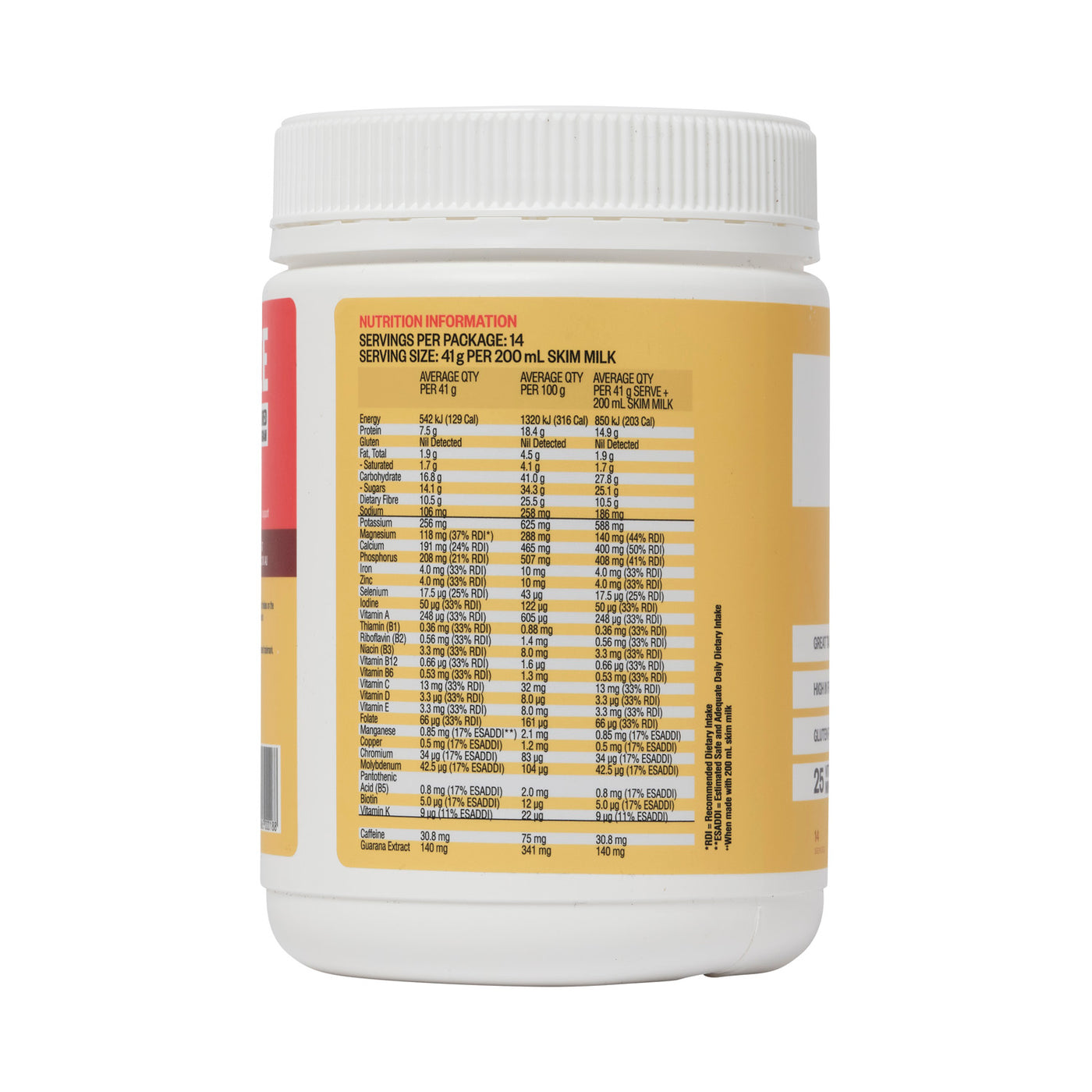 Milk Solids (Skim Milk Powder, Whey Protein Concentrate (Milk, Soy)), Polydextrose, Cocoa Powder 12%,Beverage Whitener (Glucose Syrup Solids, Hydrogenated Vegetable Oil, Milk Protein, Mineral Salts (340, 451, 452), Emulsifiers (471, 481, Soy Lecithin), Anti-Caking Agent (551), Flavour), Fructose, Flavour, Modified Starch (1442), Vegetable Gum (407, 415), Minerals (Magnesium Oxide, Sodium Phosphate, Ferric Pyrophosphate, Zinc Sulphate, Cupric Sulphate, Chromium Chloride, Manganese Sulphate, Sodium Molybdate, Potassium Iodide, Sodium Selenite), Soluble Corn Fibre, Guarana Extract0.34%, Vitamins (Vitamin C, Vitamin E, Niacin, Pantothenic Acid, Riboflavin, Pyridoxine, Thiamin, Vitamin A, Folic Acid, Vitamin K, Biotin, Vitamin D, Vitamin B12), Sweetener (Sucralose).